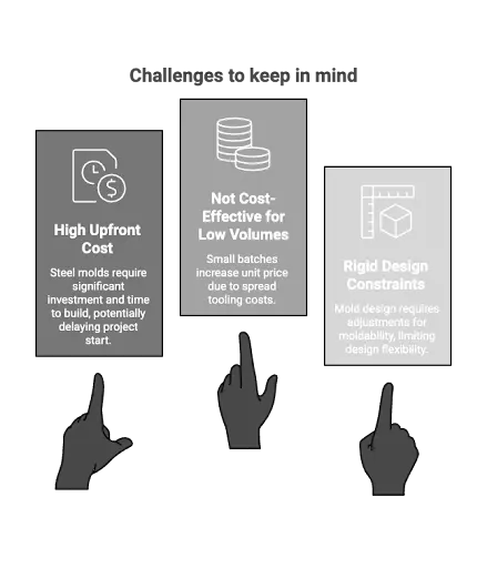 - Injection molding needs draft angles, consistent wall thickness, and no deep internal features. That can limit creativity.