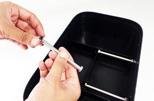 Slide two bearings onto both ends of the steal rod, then snap the rod and bearings into the PolyBoxTM