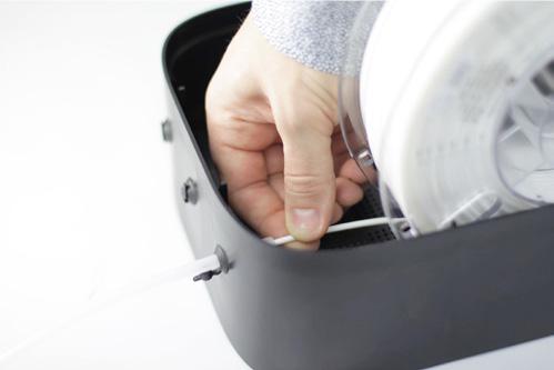 Place the spool in the PolyBoxTM and feed the filament through the rubber plug.