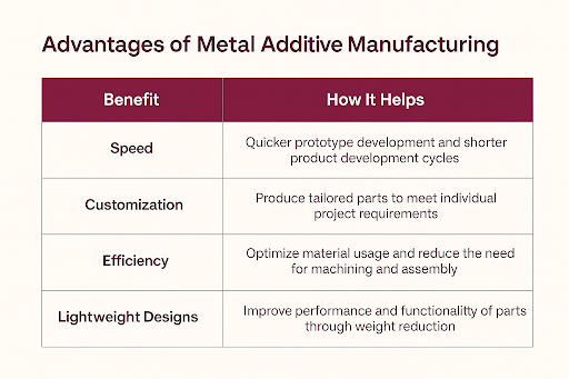 In research and development, time and flexibility matter. Metal additive manufacturing helps you move from concept to part without waiting on molds, tooling, or outsourced machining.