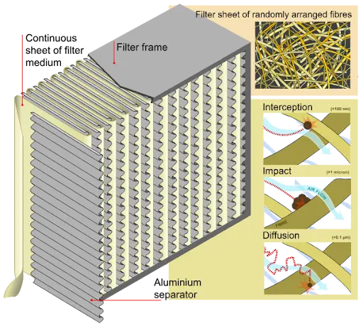 Unlike standard filters, HEPA filters use a dense, pleated fiber mesh to trap particles. As air passes through, contaminants are caught through three physical processes: